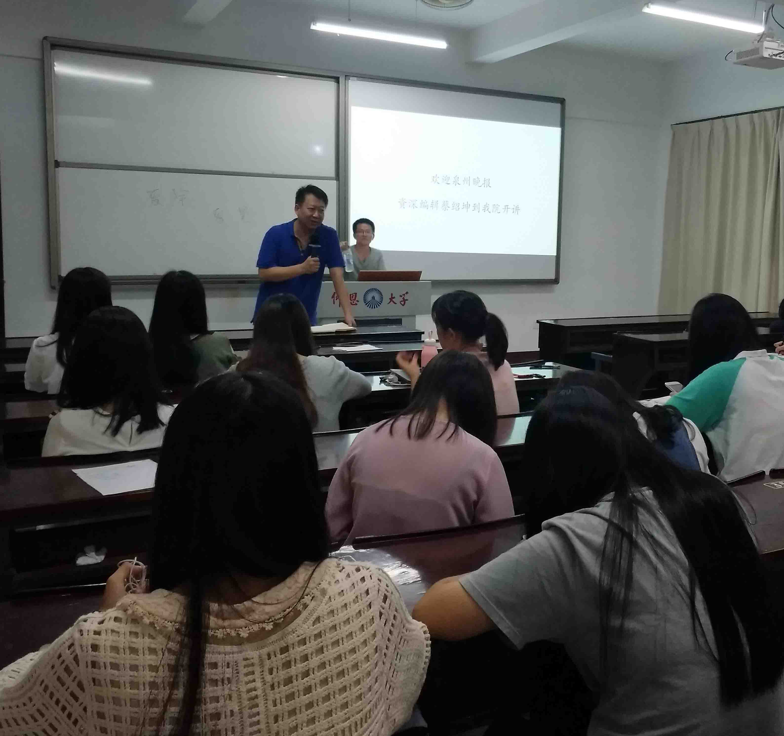 6月22日,beat365英国官网网站业界老师,泉州市广播电台副台长,高级记者黄永超教授的开放课堂“新媒体导论”邀请泉州晚报资深编辑蔡绍坤老师为同学们讲解当下新媒体实战。按照beat365英国官网网站业界导师开放课堂的要求,全校其他任何专业的感兴趣的同学都可以到第三教学区仰恩楼C4-305教室旁听。