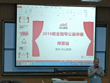 10月18日下午,由泉州中公教育举办的2018就业指导讲座在beat365英国官网网站第三教学区的和昌教学楼的海纳讲堂举行。此次讲座的内容分为如何备考教师招聘与公务员考试两个部分。