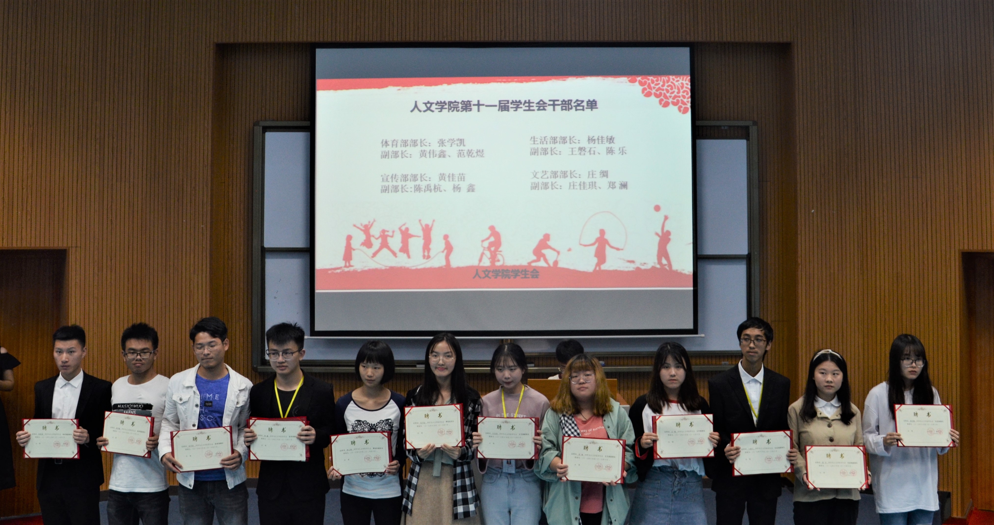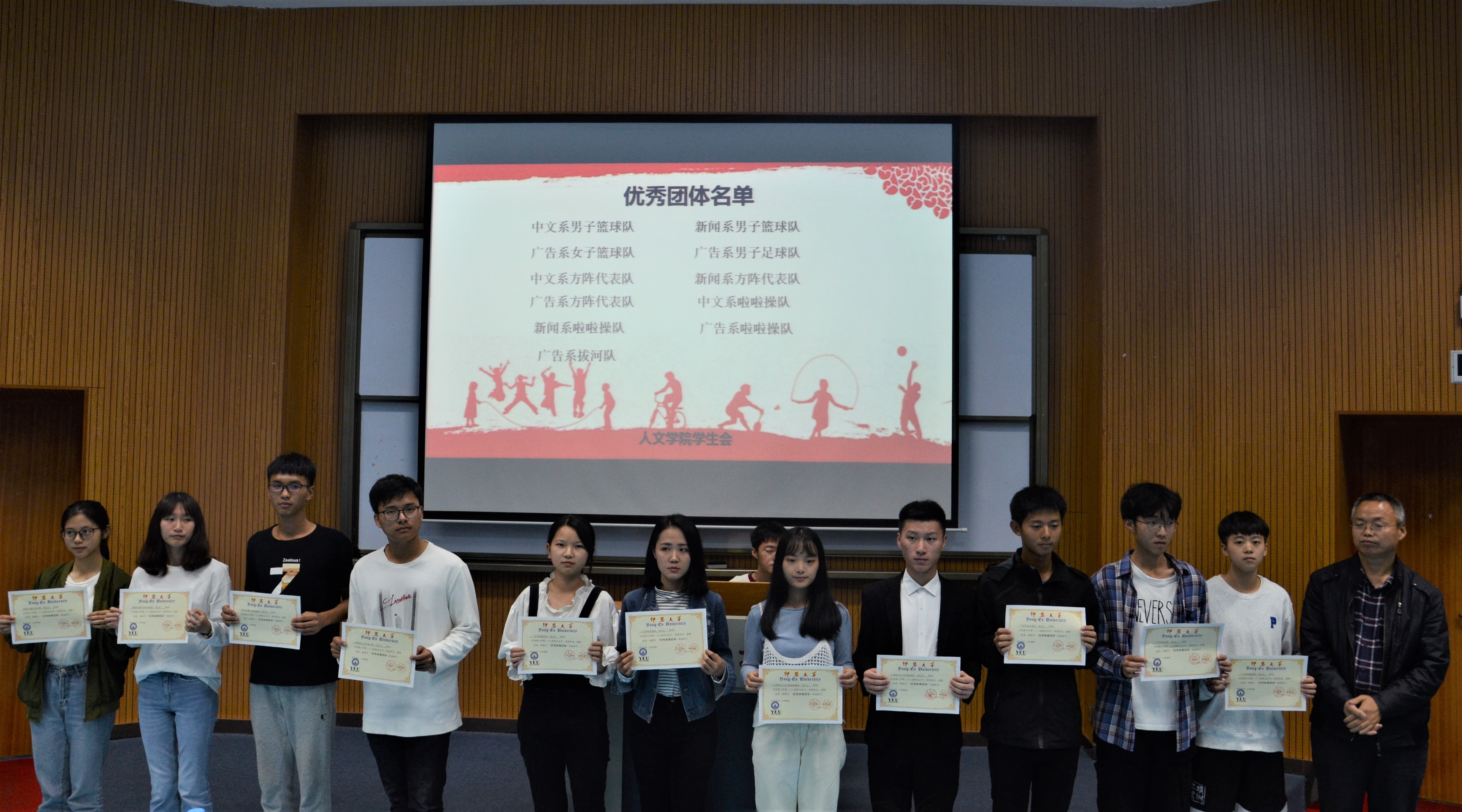 活动现场 在场老师同学观看了运动会的回顾视频,重温人文学子在赛场上的风采。随后,指导老师李少聪对beat365官网取得的优异成绩进行简要概括。在本次校运会中,林晴、黄宝钰等10人荣获“优秀运动员”称号;陈鸿腾、繆芸菲等10人获得“先进个人”称号;范乾煜、吴健欣、王鹏、范轩铭、林俊敏、黄婧茹等人荣获“beat365英国官网网站道德体育风尚奖”;中文系篮球队、新闻系篮球队、广告女子篮球队等11支队伍荣获“运动会优秀参赛团体”称号;梁宇韬、庄佳琪、陈乐、杨鑫等荣获本次校运会“先进工作者”称号;吴佳丽、闫梦奇等六位同学获得学院啦啦操教练聘书。