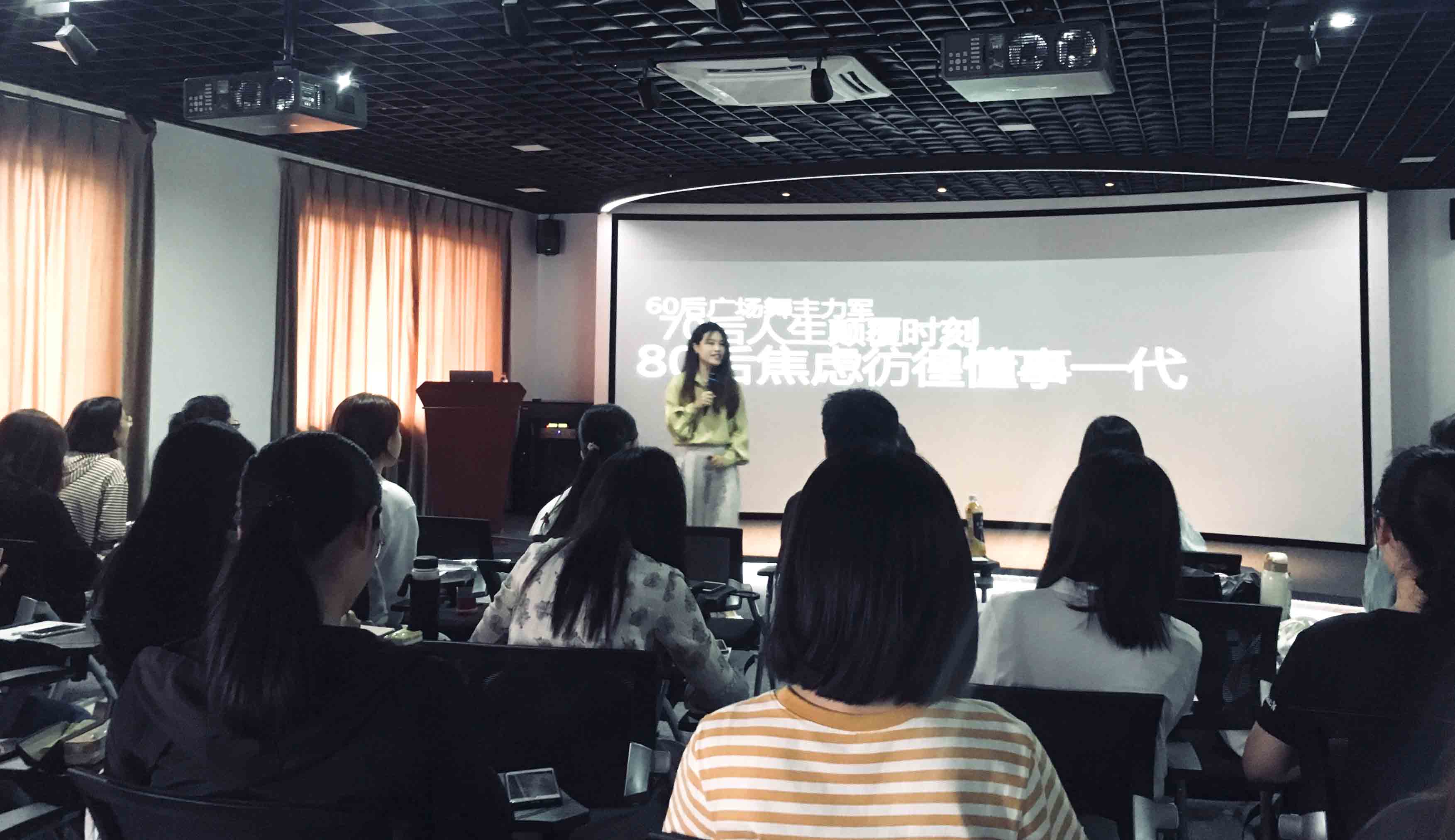 授课现场 苏丽琴老师以“屏读、追光者、切换实时模式”等热门词汇为切入点,向同学们生动分析当今新媒体运营的社会环境和前沿动态,并通过微博、微信、抖音等新媒体平台的热点事件详细阐述了爆款产生的运作机制,有效内容生产的模式和方法。之后,苏老师结合社会热点,设置不同主题,让同学们进行限时现场策划,并对部分代表性作品进行了精彩点评。