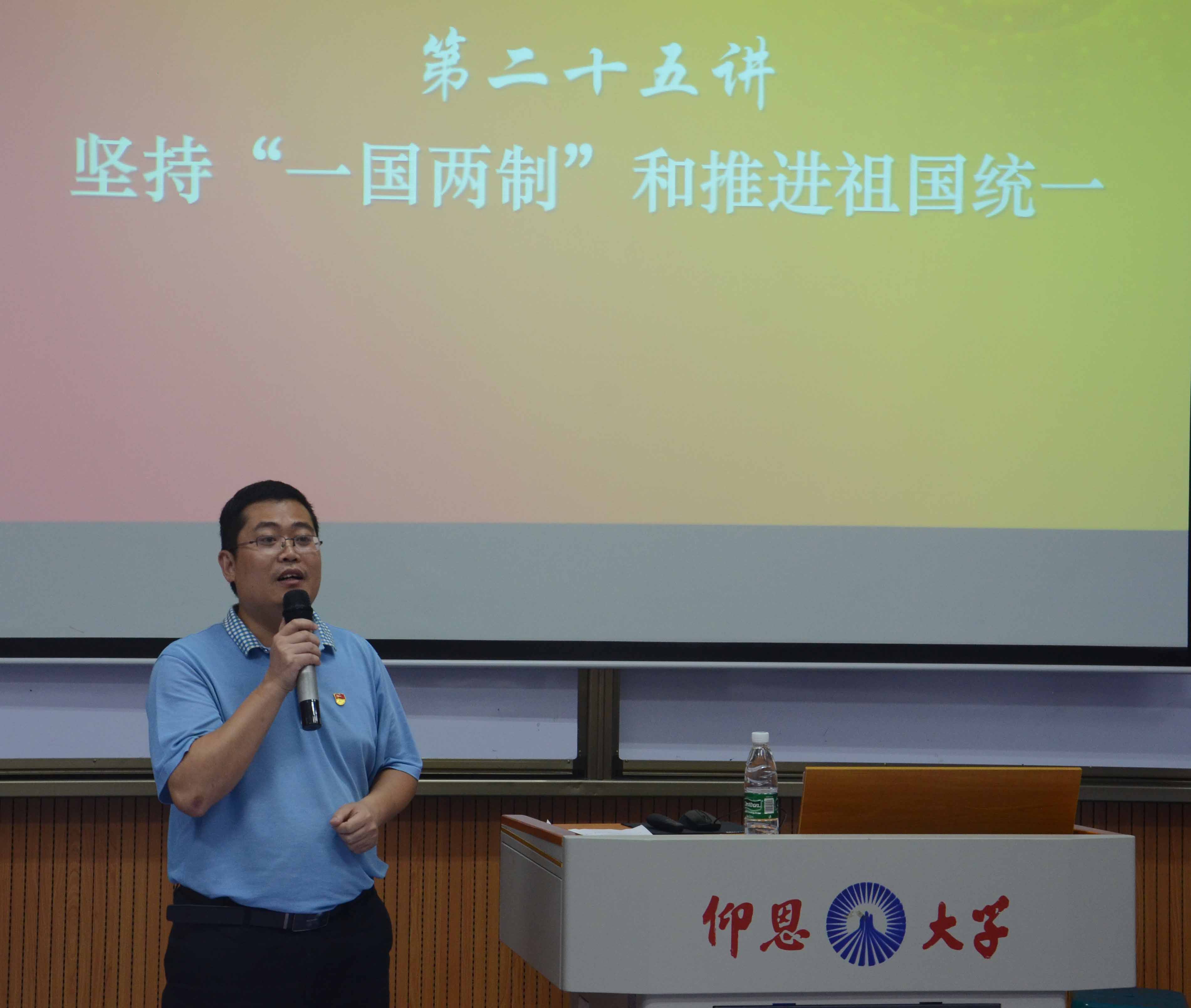 吴晓伟老师 吴晓伟结合自身学习习近平新时代中国特色社会主义思想的心得体会,凝练出“四词八字”,从“过去”“原则”“现在”和“未来”四个方面深入阐述“一国两制”与国家发展进程的伟大意义,系统讲解了“一国两制”实践的成功经验,坚持“一国两制”方针、推进祖国统一大业的根本立场和重大原则。他指出,习近平总书记关于“一国两制”的伟大构想和成功实践的重要论述,充分反映了我们党对“一国两制”实践的规律性认识达到了一个新高度。他号召大家要认真学习贯彻习近平新时代中国特色社会主义思想,保持高度自信和战略定力,继续把“一国两制”事业成功推向前进。