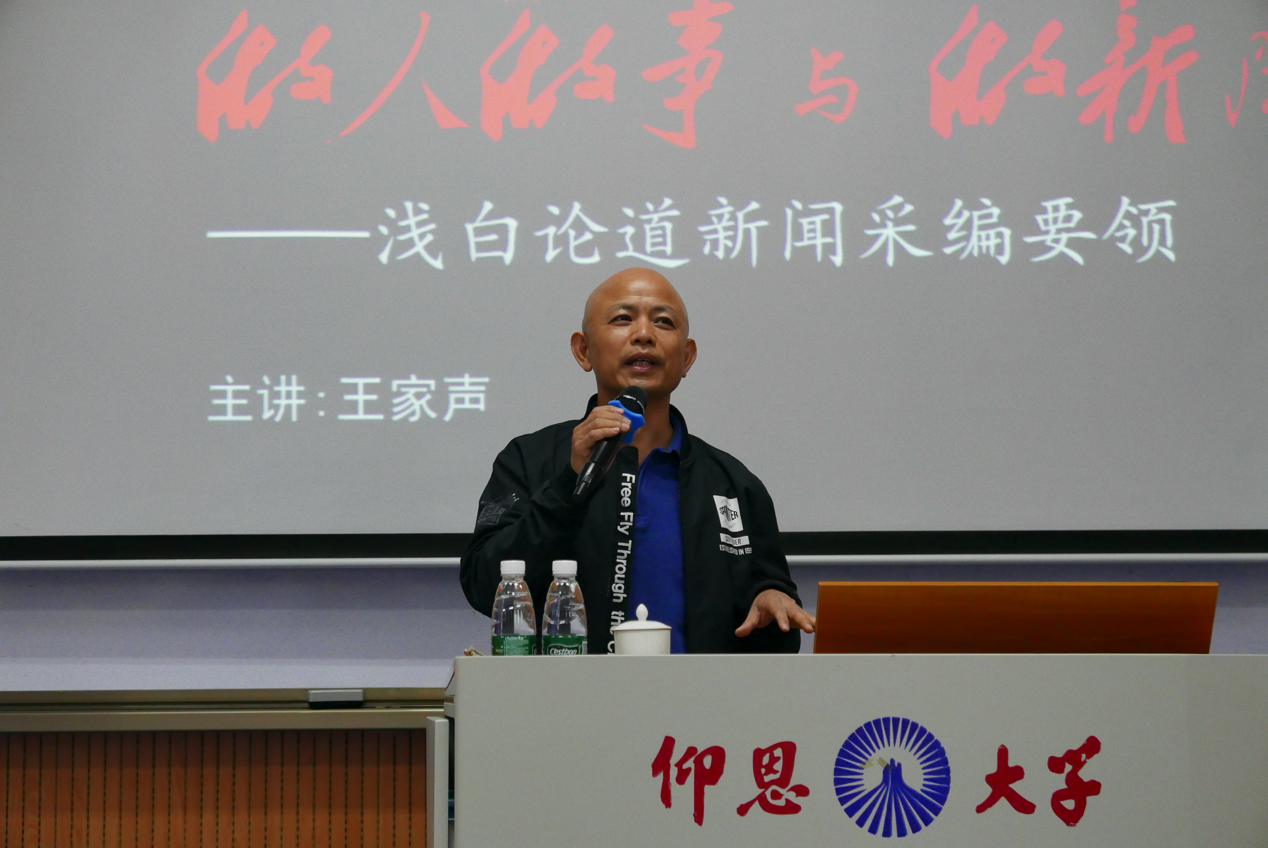 王家声教授主讲 王家声教授在新闻领域身经百战,有上百篇作品获省级以上奖。他的前沿理论与丰富阅历开阔了大家的视野。他首先提出,主流媒体和传媒人担负着重要使命与职责,不仅记录历史而且推动社会进步。接着他以案例和数据为大家分析了的传媒颠覆性变局,指出媒体、媒体人以及高校传媒专业都应该做出相应转变,往融媒体时代大步迈进。主体内容上,王教授结合亲历和经典案例,阐述了做人做事与做新闻的核心要义与采编要领。他强调,做一个优秀的传媒人,必须政治思想过硬,专业能力过硬,从业作风过硬。
