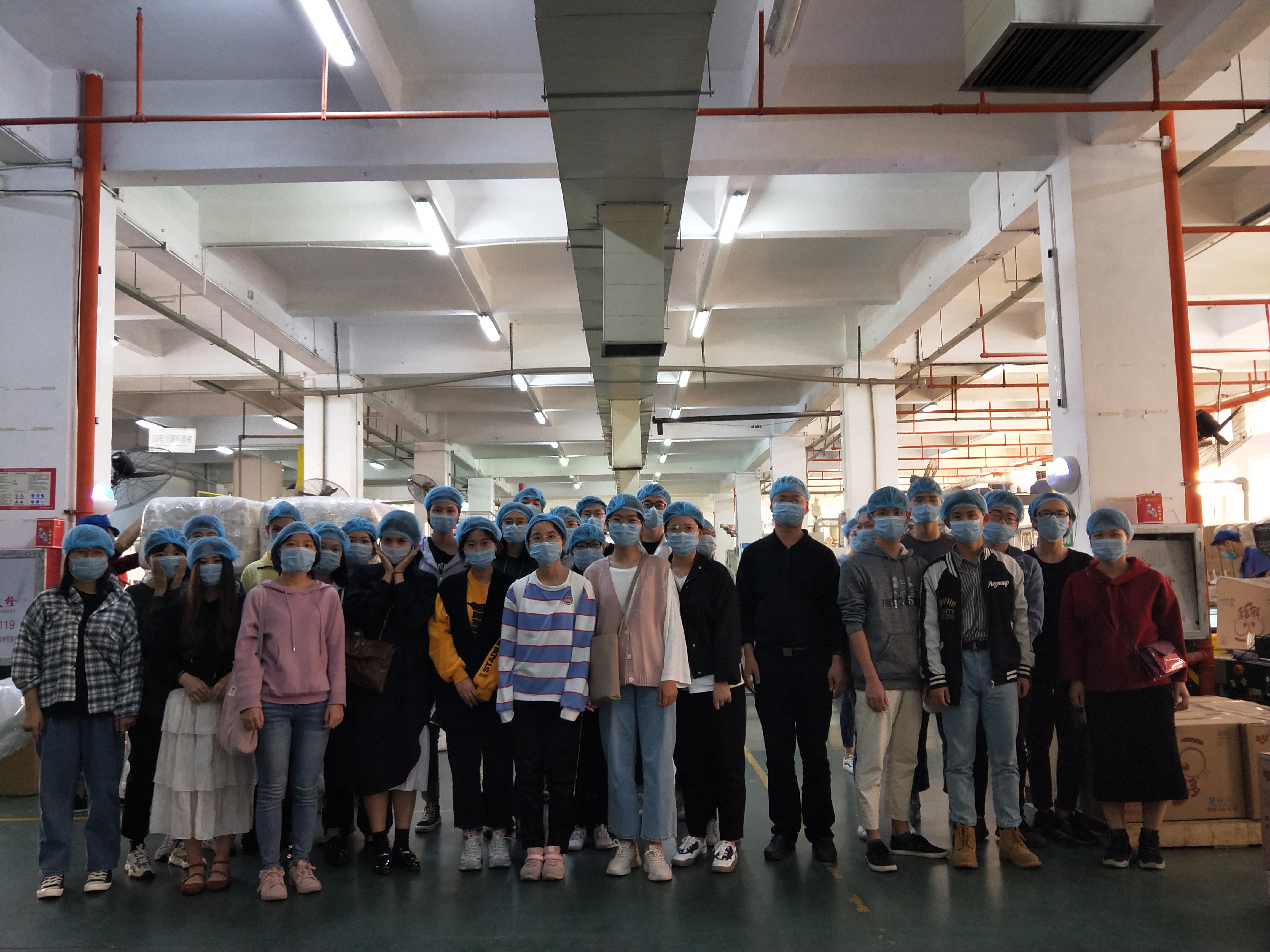 师生与趣多多卫生用品有限公司董事长合影 趣多多卫生用品有限公司张静胜厂长带领师生到生产车间,同学们带上口罩和头罩,参观了纸尿裤无菌自动化生产线,对公司加强科技研发提升品牌自主创新能力有了更为深刻的认识。