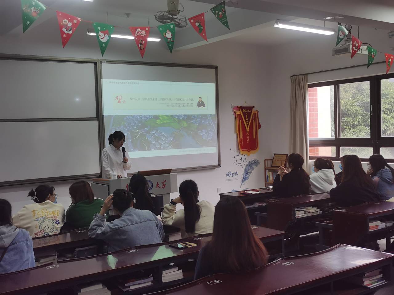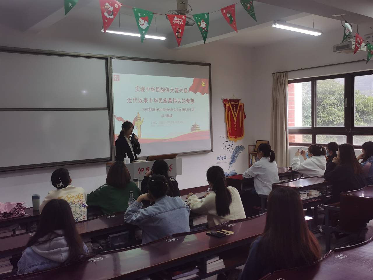 在学习过程中,各位党员同志纷纷上台分享自己的学习体会。黄淑慧同志分享学习的是关于《习近平新时代中国特色社会主义思想三十讲》中的第二十二讲的建设美丽中国。从五个方面开始讲述:一是坚持人与自然和谐共生,二是树立和践行绿水青山就是金山银山理念,三是推动形成绿色发展方式和生活方式,四是统筹山水林田湖草系统治理,五是实行最严格的生态环境保护制度。黄淑慧同志结合最近几月份大力推行的限电措施,发表自己的看法,呼吁广大党员同志要跟从党走,为建设社会主义生态文明尽一份绵薄之力。叶凤婷同志与大家分享学习的是关于《习近平新时代中国特色社会主义思想三十讲》中的第三讲:实现中华民族伟大复兴是近代以来中华民族最伟大的梦想。它是凝聚着几代中国人民的夙愿,是几代人的艰苦奋斗。叶凤婷同志用“哪有什么岁月静好,不过是有人替你负重前行”为我们阐述今天的幸福来之不易,我们要铭记,不可辜负。作为新时代的青年大学生,作为一名党员,我们要牢记党的初心和使命:为中国人民谋幸福,为中华民族谋复兴。