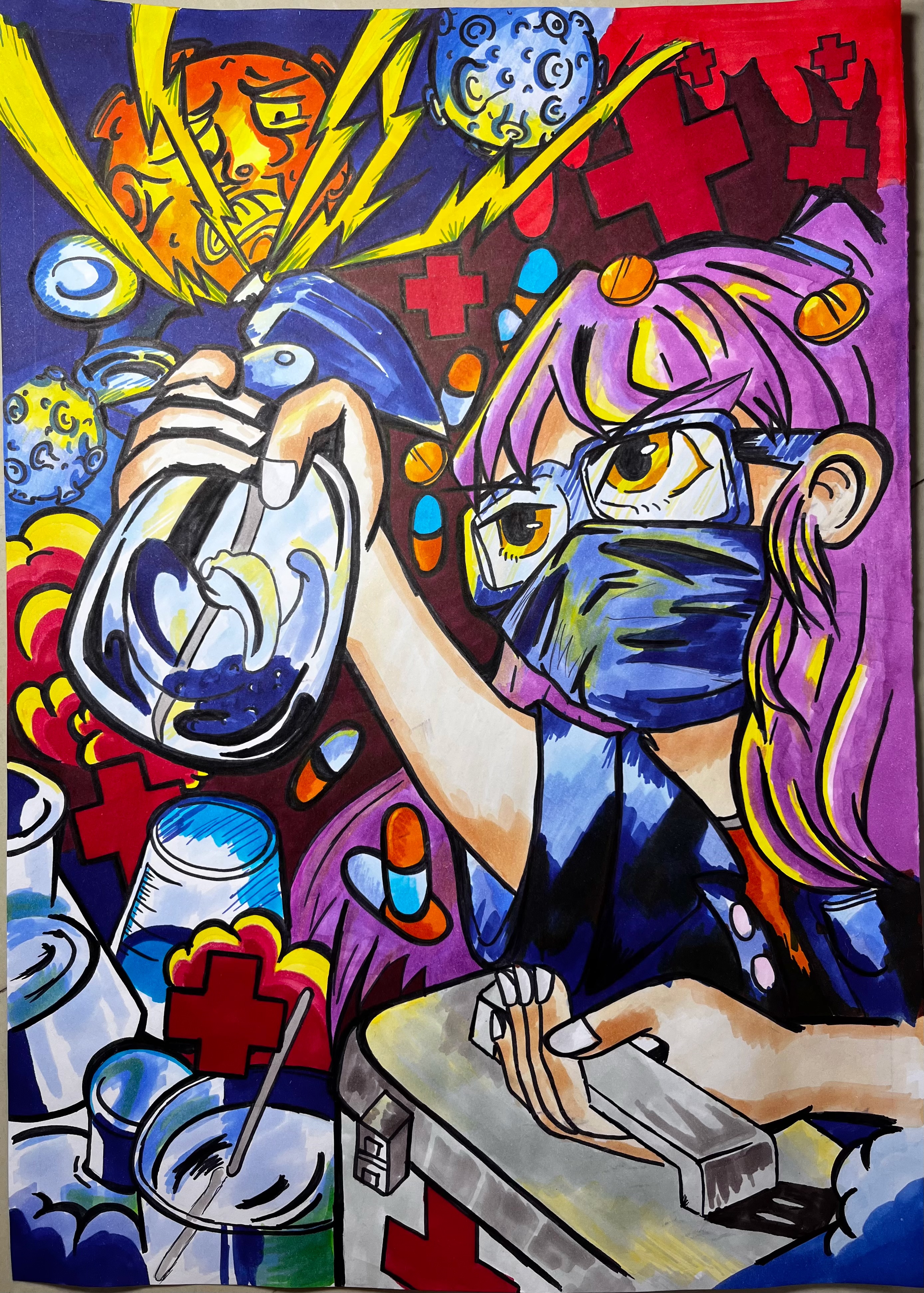 21广告专升本2班庄思宁《方块病毒》 习近平总书记曾言,艺术本就来源于人民,来源于生活,一切有价值、有意义的文艺创作,都应该反映现实、观照现实,都应该有利于解决现实问题、回答现实课题。在这场抗疫“战斗”中,人文学子表现出高度的使命感和责任感,用手中的笔共同为全国疫情防控宣传工作助力加油,用手绘作品讴歌一线抗疫英雄无私奉献的精神。