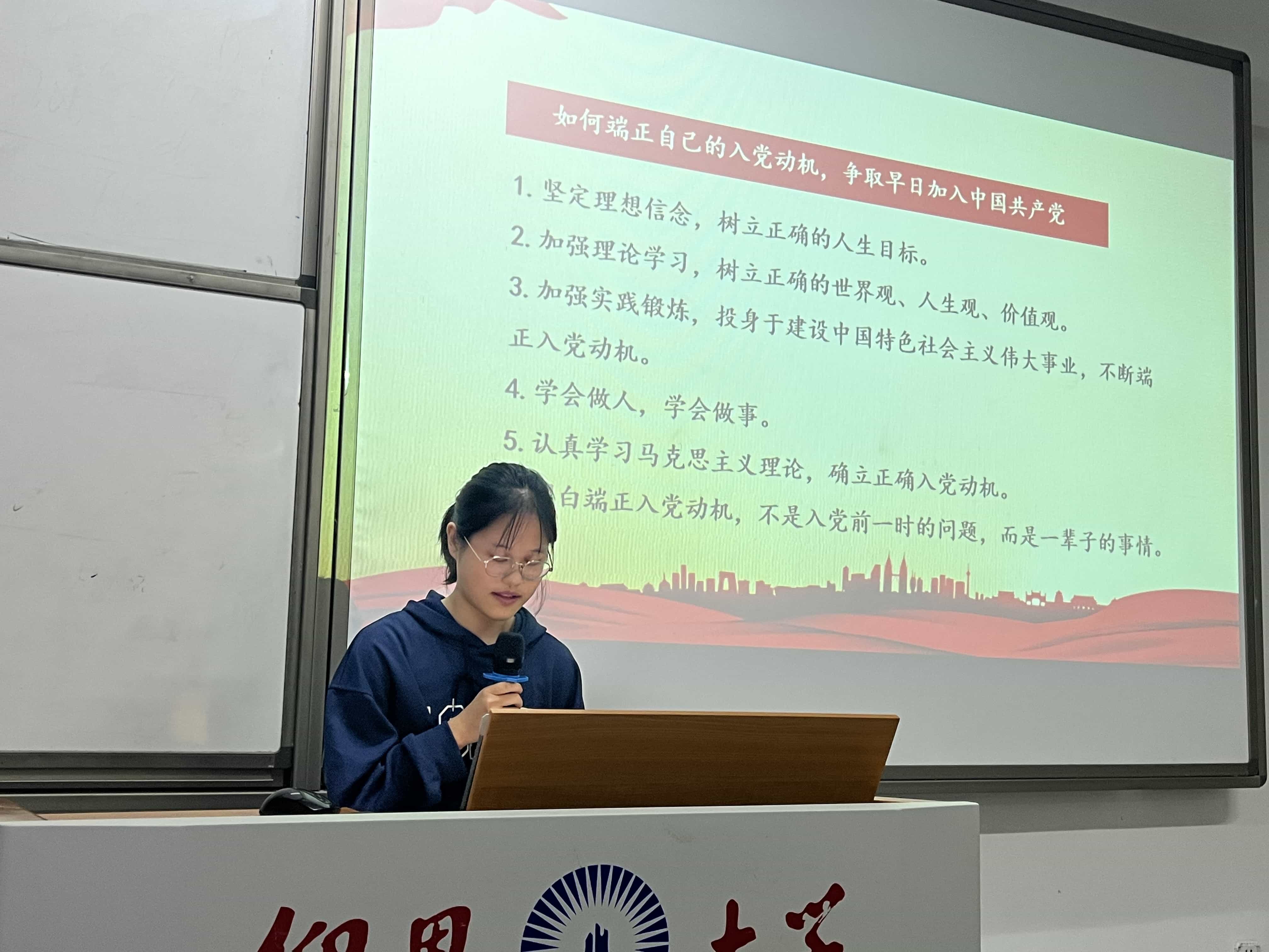 在讨论会伊始,支部书记戴舒容首先对通过层层选拔推荐确定的入党积极分子表示祝贺,并提出在接下来一年的培养考察期中,入党积极分子要认真学习党的政治理论,严于律己,在思想、学习、工作、生活等方面发挥先锋模范作用,为学院争光,为自己创造条件,争取早日加入中国共产党。