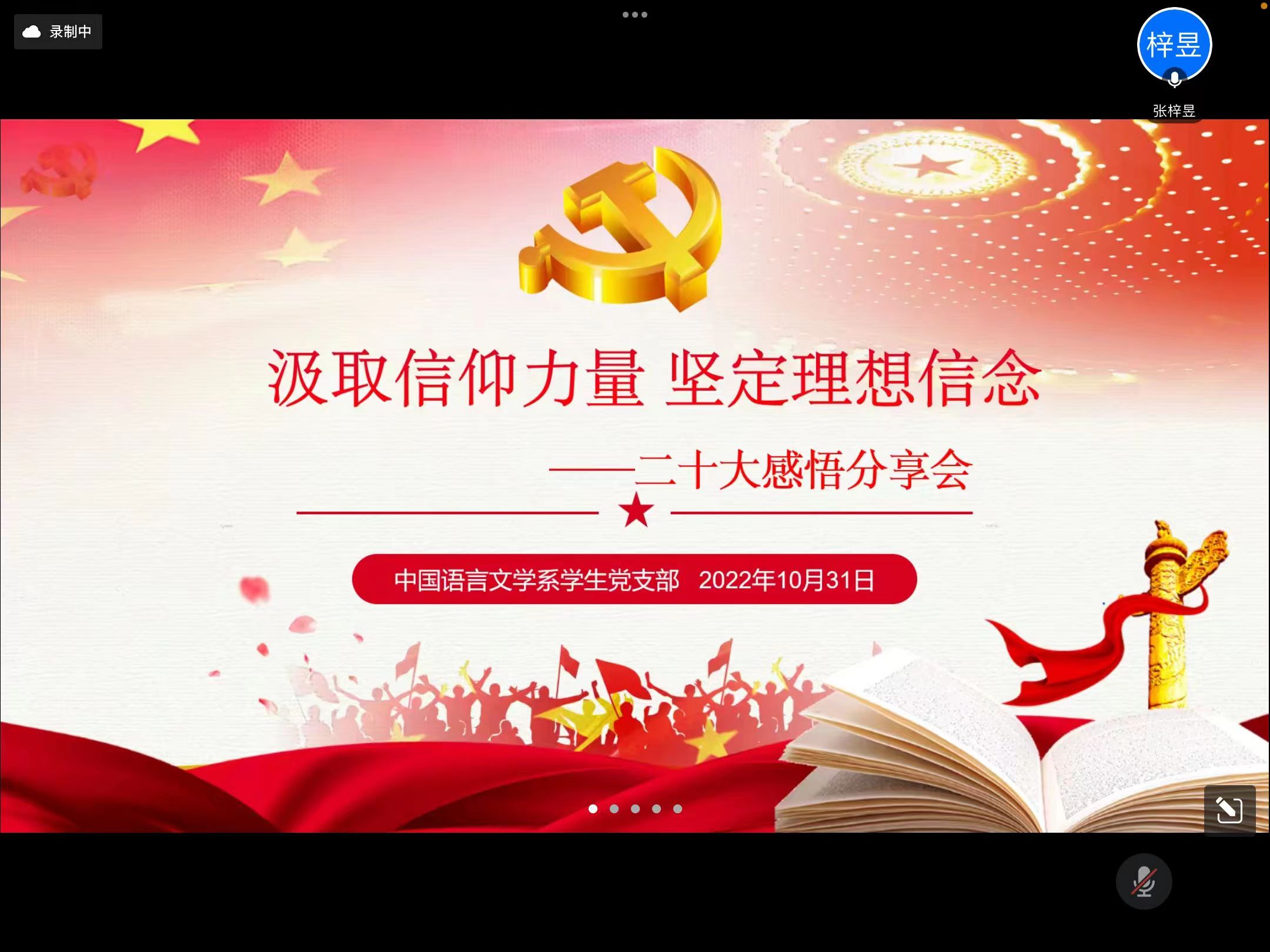 10月31日晚七点,受疫情影响,中国语言文学系学生党支部于线上开展主题为二十大感悟分享会的党日活动,张梓昱同志出席了本次的分享会。