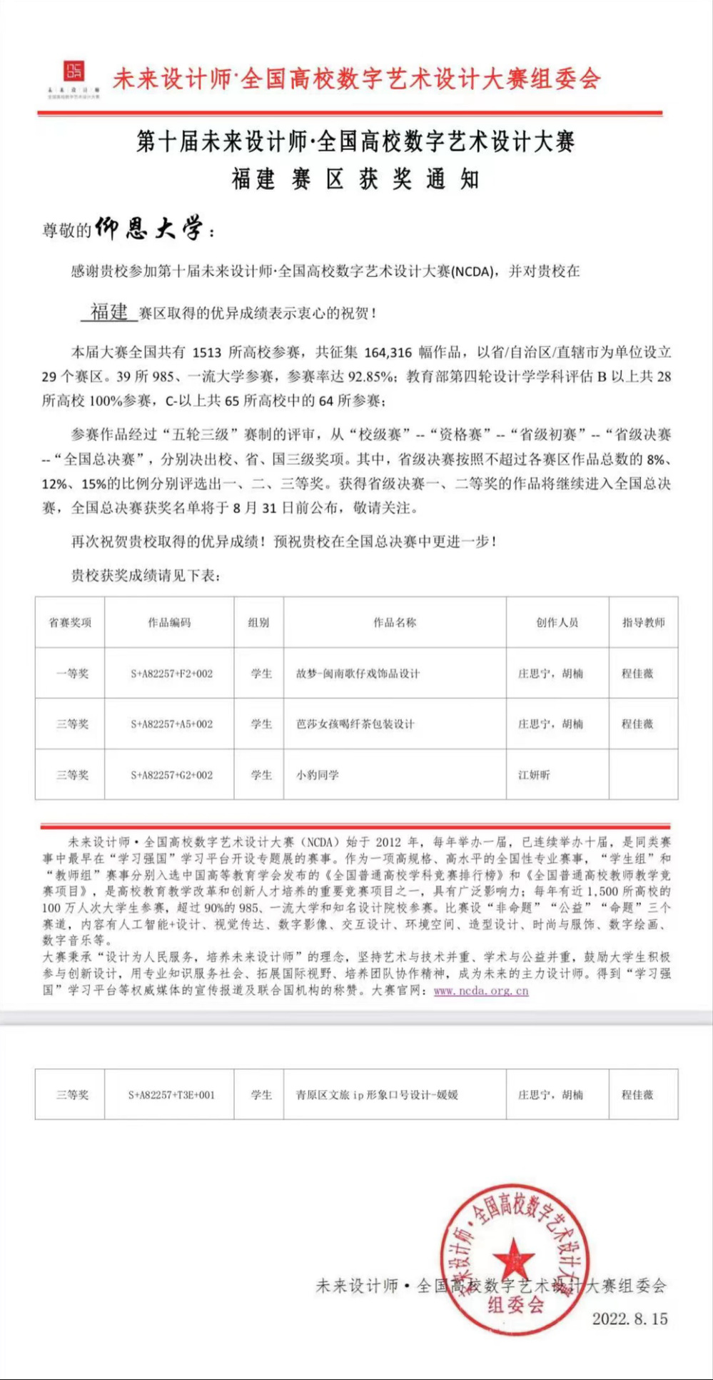 日前,由工业和信息化部人才交流中心主办的2022第十届未来设计师·全国高校数字艺术设计大赛(NCDA)省级赛获奖名单揭晓。