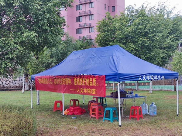 中国语言文学系学生党支部党员践行服务精神,利用课余时间来到军训场地开展志愿服务,成为军训场上另一道亮丽的风景线。并时刻关注军训中的各类突发情况,努力做好后勤保障工作,力争做到树立好党员模范形象,潜移默化带动新生热爱党、拥护党、走近党,加强对新生的价值引导。温姗姗同志表示,作为一名学生党员,理应用我所学、尽我所能,服务他人、奉献社会,在发挥先锋模范作用中想在前、走在前、干在前。
