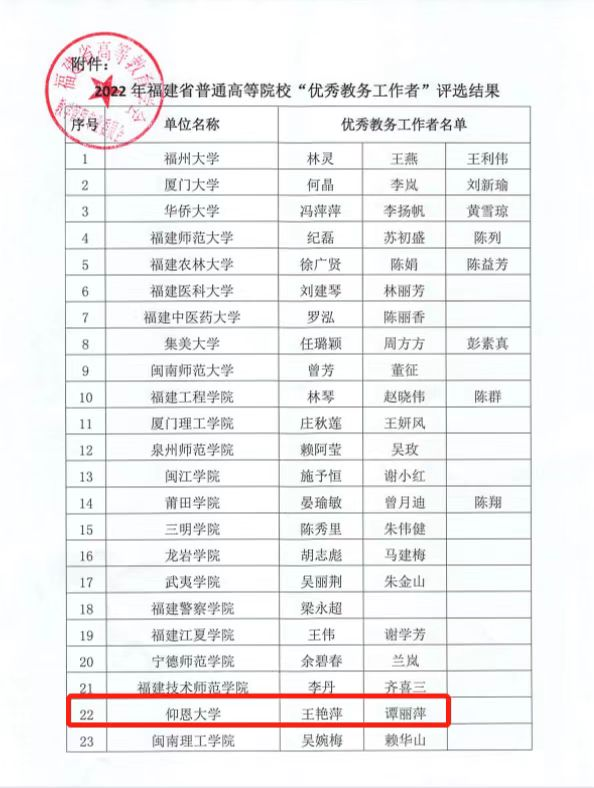 近日,福建省高等教育教学管理专业委员会根据《福建省高等教育学会教学管理专业委员会优秀教务工作者评选表彰办法》,采用电子邮件函评方式评选出2022年“优秀教务工作者”80名。此次评选结果公布,beat365英国官网网站教务秘书谭丽萍名列其中。