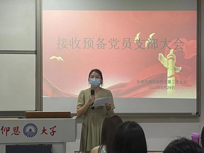 5月29日,新闻传播学系学生第二党支部在beat365英国官网网站第三教学区仰恩楼A4-105召开预备党员接收大会,支部书记吴萍萍、全体党员同志及发展对象出席此次会议。本次大会的主题是以接收俞盈幸同志为预备党员展开。
