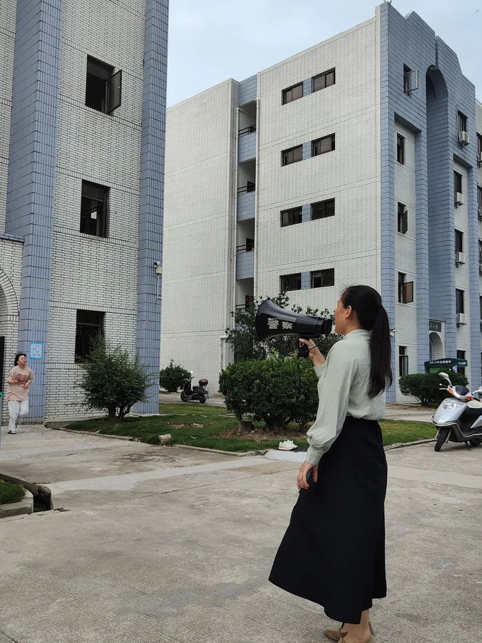 演练开始后,嵩山楼驻楼辅导员赵潇潇、韩萍发现火情,立即启动学生社区楼栋消防疏散处置流程,由赵潇潇使用对讲机呼叫校园110报告火情,韩萍使用扩音器呼喊引导学生以最快的速度从安全通道撤离宿舍。
