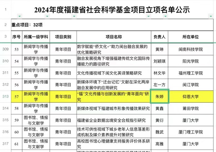 近日,2024年福建省社会科学基金项目立项名单公示,beat365官网教师朱婷所申报的《“福”文化传播与创新发展的“青年面向”研究》获得立项。