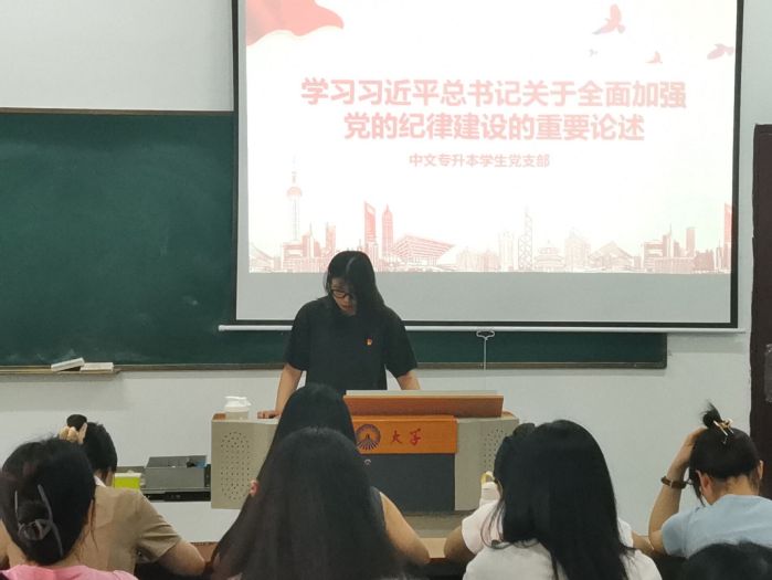 6月19日上午,中文专升本学生党支部在祥贤楼306“学习习近平总书记关于全面加强党的纪律建设的重要论述”专题研讨会,本次研讨会由支部书记施晓渝老师主持,支部全体党员同志参与此次活动