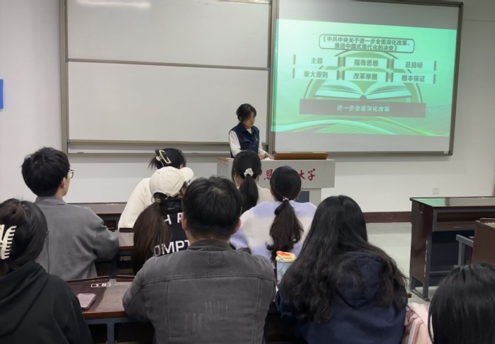 为引导支部党员用全会精神统一思想,凝聚力量,11月20日下午,新闻传播学系学生第一党支部于仰恩楼B4-205教室举行了“深入学习贯彻习近平总书记关于全面深化改革的一系列新思想、新观点、新论断和党的二十届三中全会精神”的主题党课。