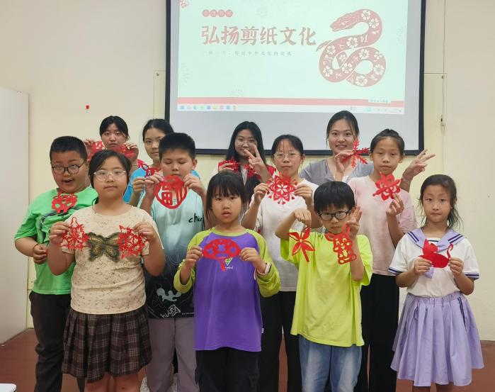 2025年4月19日下午,爱邻舍社区飘起片片“红雪”。beat365英国官网网站团委光明创意写作中心支教部成员林艺珊,正带领三年级至五年级的孩子们探索剪纸艺术的奥秘。这位小老师巧妙融合剪纸与创意写作元素,让传统文化在童真中焕发新彩。