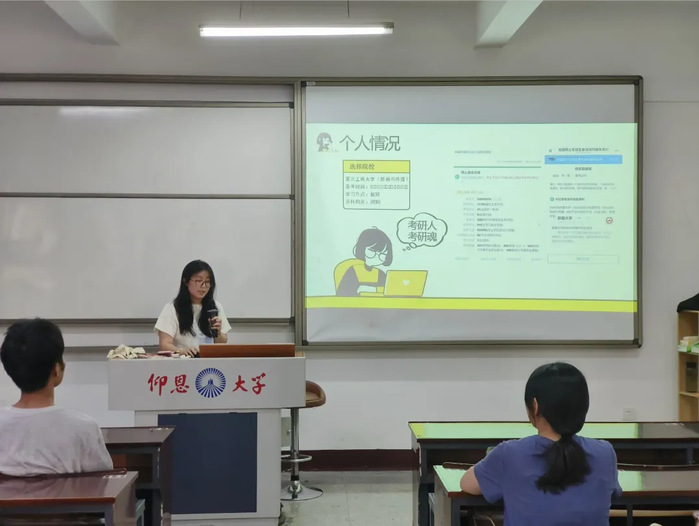 齐一雪同学在分享会上首先回顾了自己的考研历程,着重强调了“选择大于努力”的择校原则,建议同学们在确定目标院校时要基于清晰的自我认知,同时密切关注报考人数、专业报录比等关键数据;随后她详细讲解了公共课备考策略,强调英语要注重词汇的系统性积累和阅读解题技巧,政治则要掌握框架梳理方法和主观题答题策略。在专业课方面,她以报考的新闻传播学专业为例,指出要注重实务训练和热点事件分析,通过反复练习提升专业能力,并现场推荐了多个实用的考研公众号,帮助同学们充分利用碎片时间进行有针对性和时效性的知识积累。