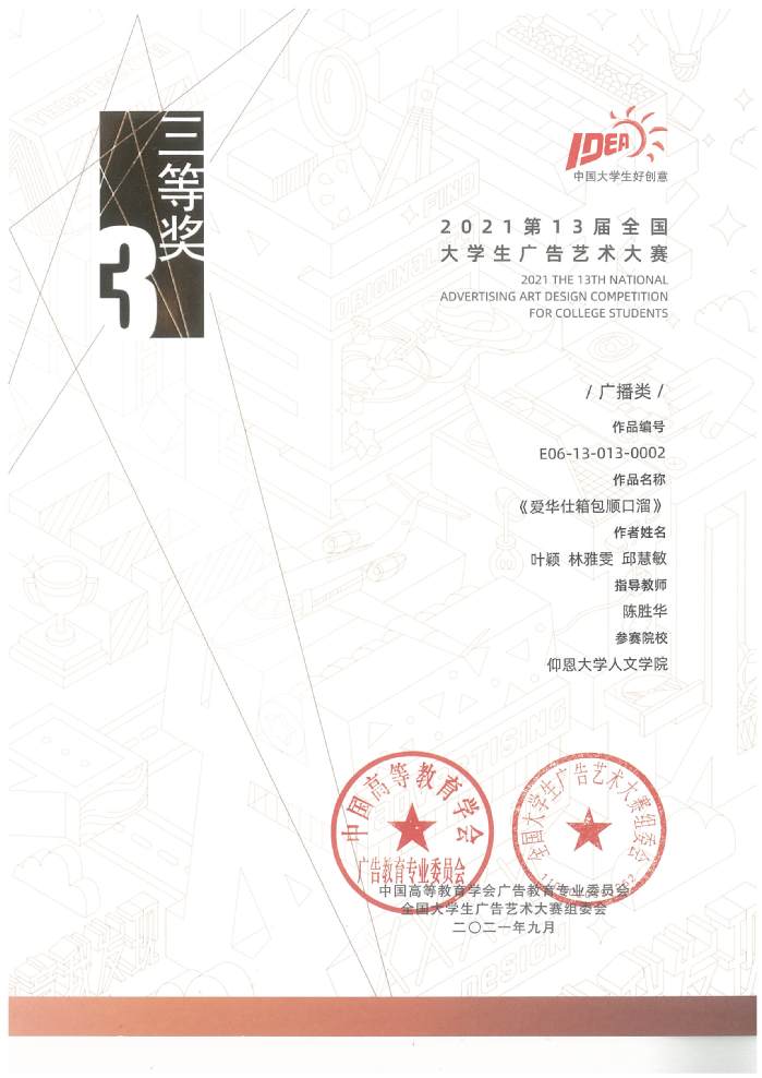 学院高度重视学生实践能力与创新精神培养,积极鼓励学子们参与各类赛事。新闻学专业学生在各类学科竞赛、创新创业项目中成绩斐然。近些年来,在新闻学专业教师组织指导下,学生参加全国大学生广告艺术大赛、“互联网+”大学生创新创业大赛等赛事,多次斩获国家级、省级奖项。在全国大学生广告艺术大赛中,新闻学子获得全国二等奖和三等奖各1项,省级一等奖多项,省级二、三等奖各几十项,2019级新闻学专业郑龙森同学获得2021年福建省“互联网+”大学生创新创业大赛高校主赛道的银奖。